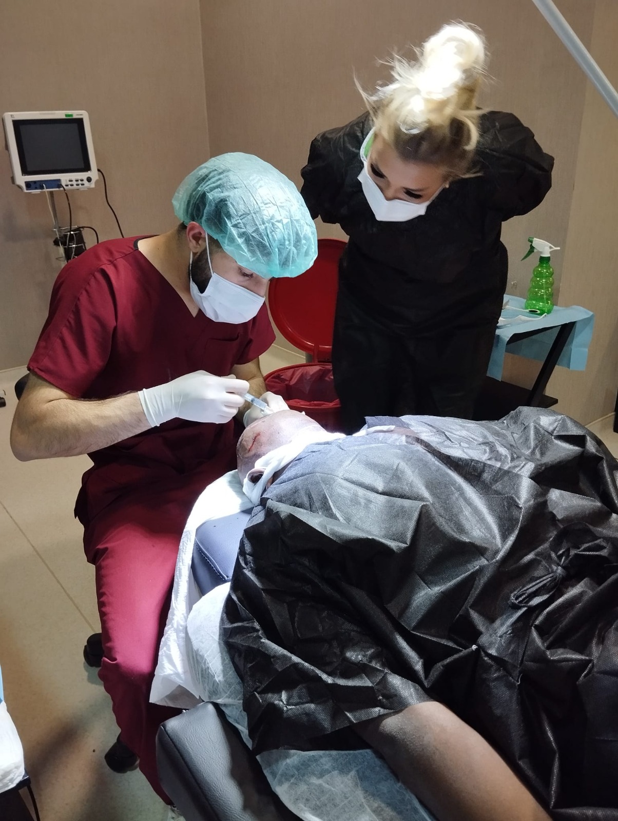 Local anesthesia, FUE extraction, and FUE/DHI implantation.